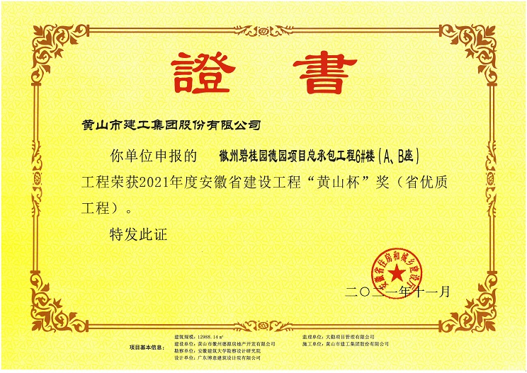 由黃山建工集團(tuán)承建的徽州區(qū)碧桂園德園項(xiàng)目總承包工程6#樓(A、B座) 工程榮獲安徽省工程質(zhì)量最高獎(jiǎng)“黃山杯”獎(jiǎng)。該工程在開(kāi)工伊始,項(xiàng)目部就制訂了創(chuàng)優(yōu)目標(biāo),嚴(yán)格過(guò)程控制,建立健全項(xiàng)目質(zhì)量管理體系,狠抓現(xiàn)場(chǎng)施工管理,把好施工過(guò)程質(zhì)量控制關(guān),為創(chuàng)精品工程打下堅(jiān)實(shí)的基礎(chǔ)。