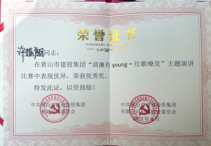 為慶祝中國共產(chǎn)黨成立102周年,深入推動(dòng)學(xué)習(xí)貫徹習(xí)近平新時(shí)代中國特色社會(huì)主義思想主題教育,全面貫徹落實(shí)黨的二十大精神,8月18日,由黃山建投集團(tuán)舉辦的“清廉有young·紅歌嘹亮”主題思政課隆重舉行,參賽選手以生動(dòng)的語言、動(dòng)聽的歌聲、真摯的感情為大家?guī)硪粓鰟e開生面的視聽盛宴,黃山建工集團(tuán)青年員工許振翔在思政課演講比賽中取得優(yōu)勝獎(jiǎng)。