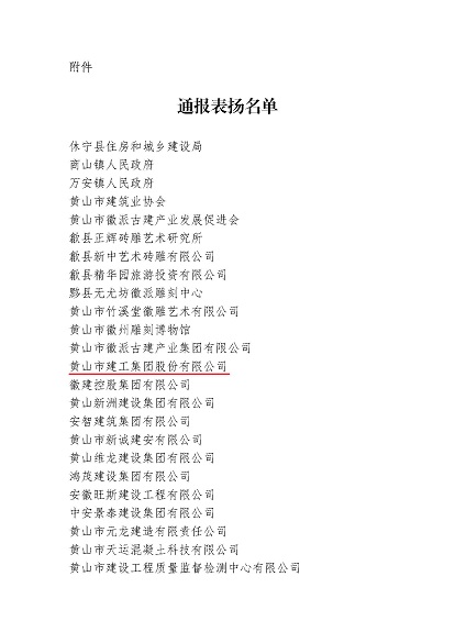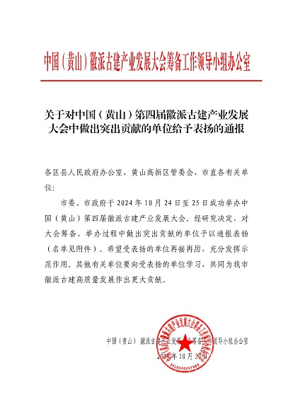 市委、市政府于2024年10月24日至25日成功舉辦中國(黃山)第四屆徽派古建產(chǎn)業(yè)發(fā)展大會。近日,中國(黃山)徽派古建產(chǎn)業(yè)發(fā)展大會籌備工作領(lǐng)導(dǎo)小組辦公室發(fā)布《關(guān)于對中國(黃山)第四屆徽派古建產(chǎn)業(yè)發(fā)展大會中做出突出貢獻(xiàn)的單位給予表揚的通報》,黃山建工集團(tuán)榮列其中。
